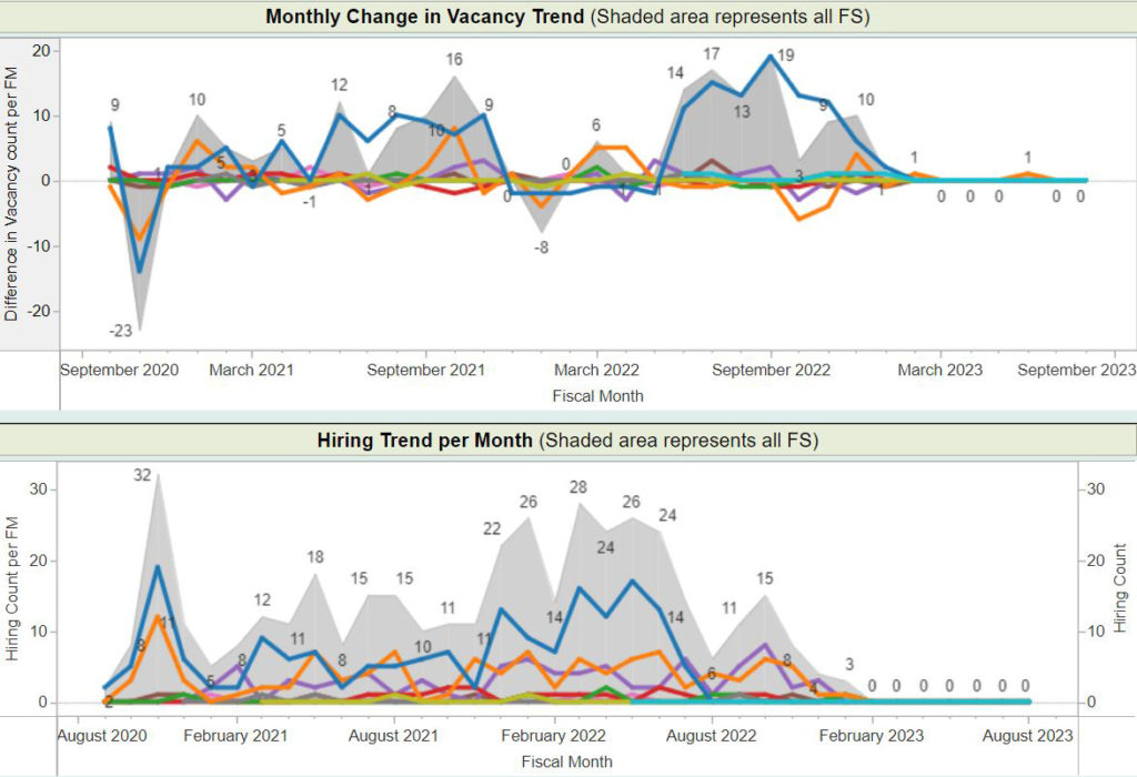 Graphical representations of data allow the viewer to easily see trends and help identify when to pivot. The following dashboard depicts the monthly staffing levels over multiple years for multiple departments. The visualization can identify the impact on departments when various new initiatives are rolled out. One use case for this dashboard is to help identify the effects on staffing with a change in minimum wage. Did we lose positions when the city raised base pay to $22 per hour? This kind of visualization helps differentiate assumptions from reality. Additional aspects that can be added are staffing-per-square-feet to add more dimension to the data.
