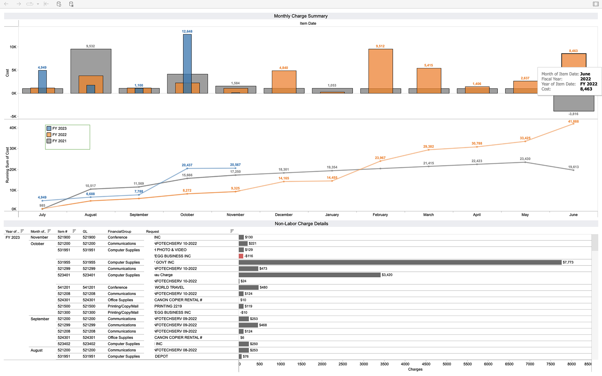 There are several financial dashboards that can be created, ranging from simple expense monitoring to complex accounting. On the simpler side, financial dashboards that identify expenditures and trends can be highly useful. It can be difficult to quickly identify the trajectory of expenses in a spreadsheet format. The following financial dashboard example shows expenditures as both monthly totals (bar chart) and total cumulative expenses (line chart) by fiscal years. This gives the user the ability to quickly identify current and historical costs. When taking advantage of visualization tools like Tableau, the graphical representations of data may also act as filters for the tabular data. This particular dashboard also summarizes expenses by financial coding. Individual transactions can be viewed by selecting any of the lower horizontal bars. As demonstrated here, a successful dashboard requires the developer to be able to identify both the audience for the dashboard as well as the data requirements of the dashboard.