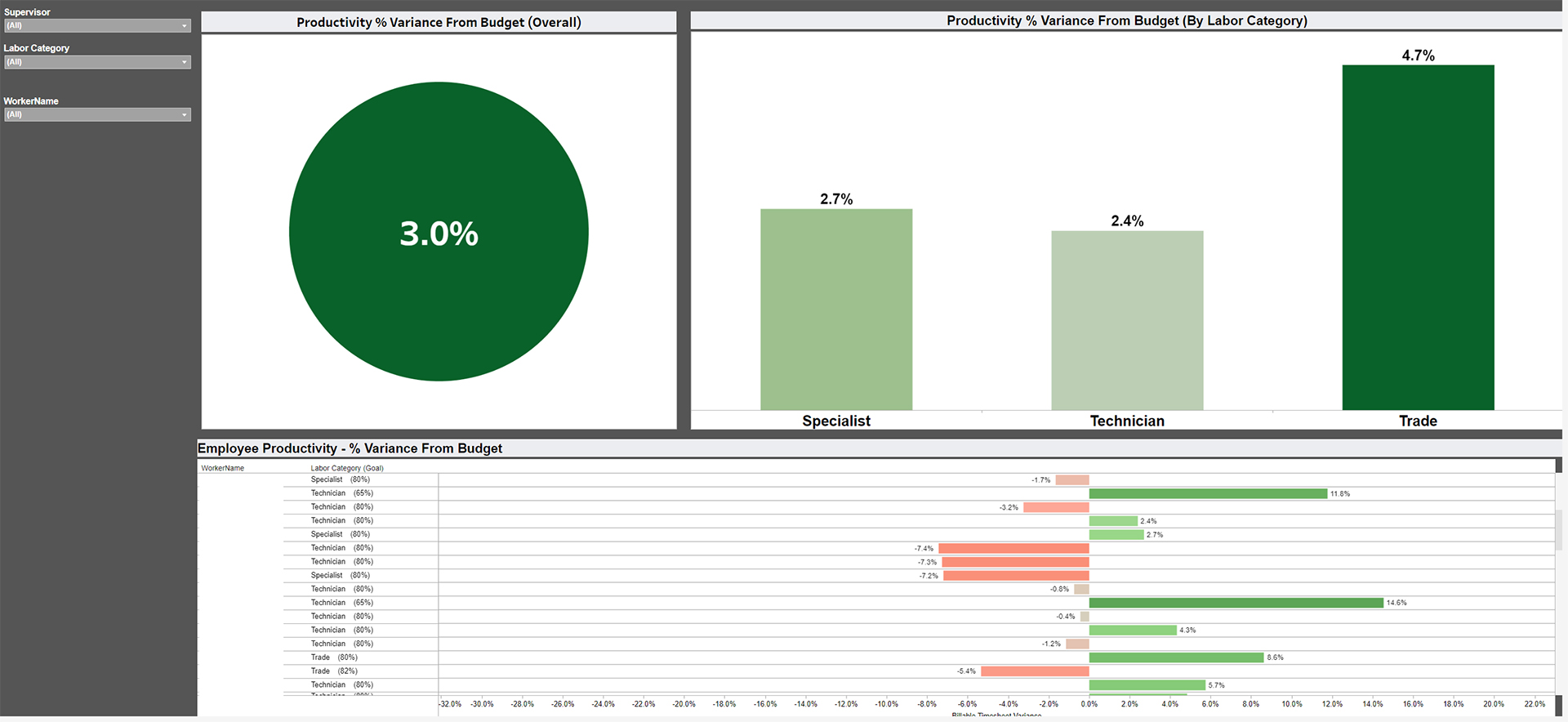 The primary KPI (key performance indicator) represented by the number in the green circle is the overall aggregated average of all staff included with the search filters. The vertical bar chart shows the same percent variance by employee category. The diverging bar chart on the bottom identifies individual staff variance. The dashboard filters enable the analysis on various supervisors or any specific trade down to selected individuals. The data can be explored further using tooltips or selections of the diverging bars.