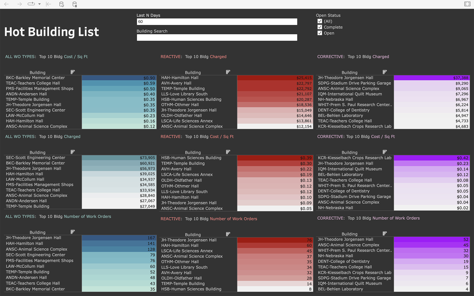 Another similar take on building costs is ranking buildings on the various costs. The example below has been nicknamed the “Hot Building List.” The request started out with the question, “Where should my focus be this week?” Now the visualization is much more valuable than that, as it can be used to assist in making numerous decisions. It breaks down the top ten building costs per square foot, total costs, and work order counts from the perspective of planned and unplanned maintenance or both. It also allows the user to select how many days to analyze and provides the ability to select a building.