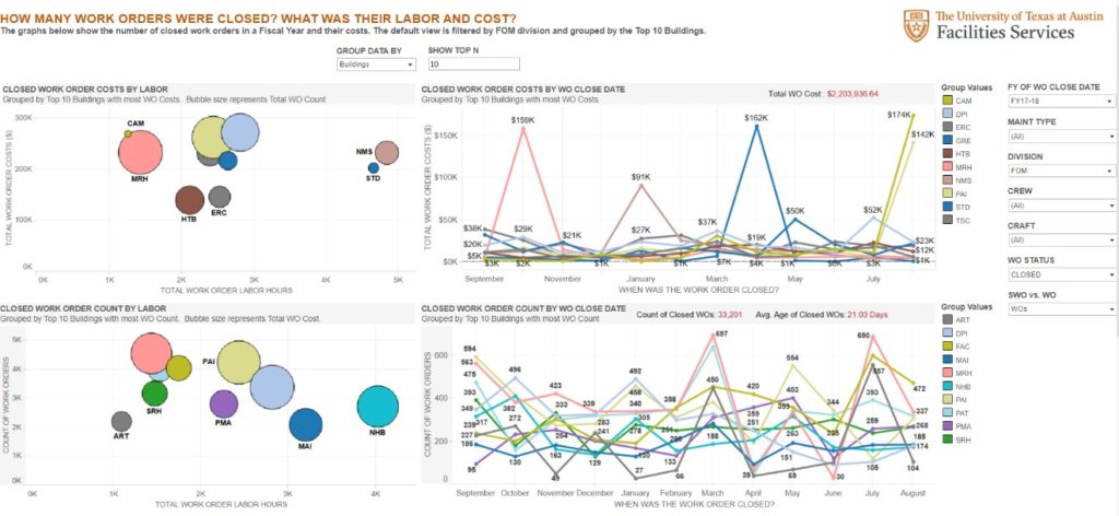 These are common questions for informatics or analytics teams getting started. The APPA informatics work group has compiled a few examples from their collections to help teams to either find a place to start or gain additional insight into successful data visualizations/tools to aid in decision making. The experienced teams out there know that some dashboards of key metrics can begin with the greatest intentions then fall short of their expected use. Having a good place to start may provide a slight advantage. The following dashboards provide examples of how Big Data can be used to analyze financial, productivity, staffing, and building costs measures.