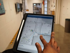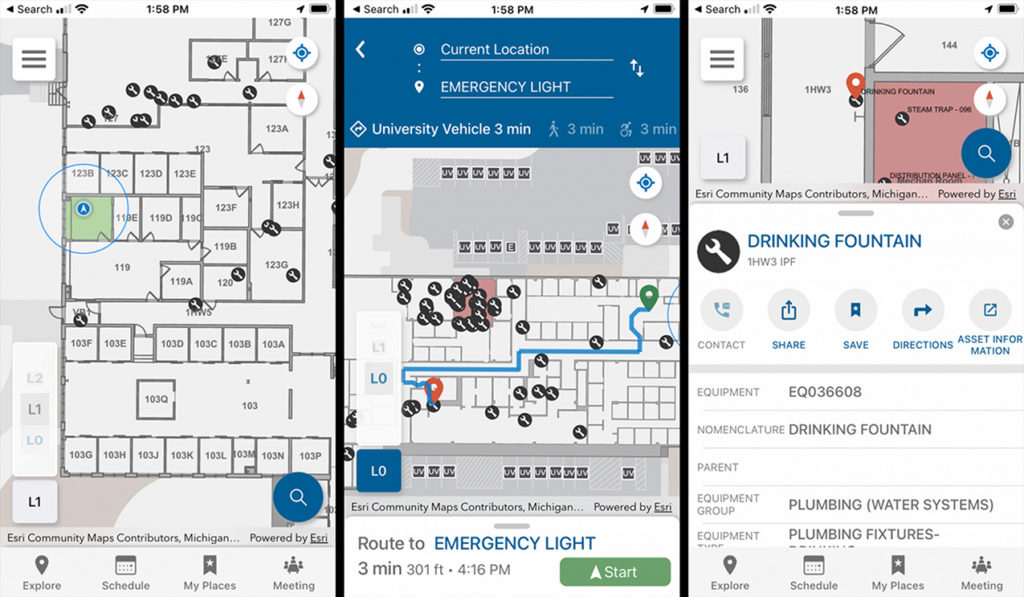 At 24.7 million square feet spread across more than 550 MSU buildings, it’s not hard to lose a few minutes finding your way to a room in an unfamiliar part of campus. That’s something maintenance staff in Infrastructure Planning and Facilities (IPF) can experience when they’re called on to service building assets such as pumps, steam traps, and other critical equipment that are intentionally placed out of sight. To help personnel more easily find their next job site and better serve our campus customers, IPF introduced a new application for their mobile devices that provides staff with turn-by-turn navigation. Called ArcGIS Indoors, the app on their work-provided mobile device guides staff across campus by vehicle, bike, or by foot to the university vehicle parking space closest to the right facility entryway and then directly to the room or building asset leveraging floor plan awareness up, down, and throughout our facilities.