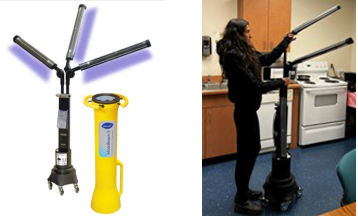 The latest technology in action at the custodial department is the Moonbeam Ultra Violet – C (UVC) disinfection machine. The Moonbeam UVC disinfection solution optimizes the ultraviolet C light for fast, non-toxic, effective, reliable, and responsible disinfection in classrooms, offices, common areas, and touch points. This is disinfection with light, reducing the workforce exertion associated with manual cleaning, wiping with toxic chemicals, the many labor hours, and operating costs. The Moonbeam UVC disinfection solution reduces the risks of employee, faculty, or student contact with toxic cleaning chemicals. It is highly effective, cost effective, compatible with all surfaces, portable, and covers hard-to-reach areas.
