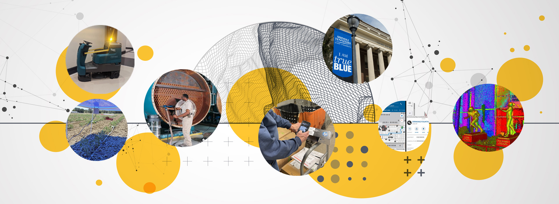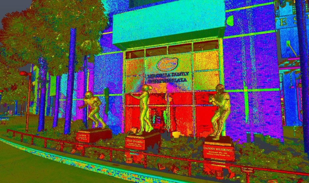 The University of Florida has employed Light Detection and Ranging (LiDAR) and unmanned aerial vehicles (UAVs) for the enhancement of geospatial information collection on campus. The initial focus of the technology implementation incorporates campus exteriors where the scans, which use a pulsed laser to measure distance, are used to document, correct, or collect visible features on campus including utility poles and manholes, roadways, and signage. This provides a more accurate placement than GPS or manual location tagging conducted through other methods. In addition to LiDAR, UAVs have been utilized to capture high-definition and thermal imagery, which can be processed to 3D geocoded images and integrated into GIS. These processes are currently being used to document construction stages for underground utility infrastructure projects to ensure the accuracy of line placement in the campus GIS system.
