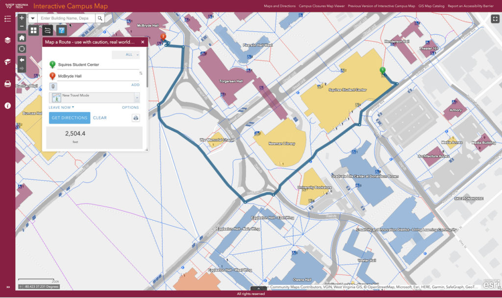 Virginia Tech launched a new interactive campus map in 2022. In addition to a cleaner layout, one of the map’s most notable features is a navigation tool that helps users identify routes that utilize accessible pathways, entryways, and elevators. The tool automatically checks for pathway closures, construction sites, or other potential obstacles and routes users around those elements.