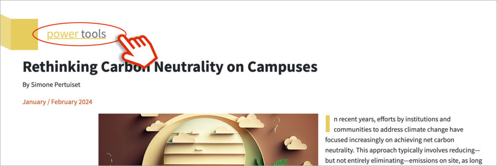 This Facilities Manager brings some changes, too. For one thing, we’ve made it easier for you to find additional content that may be relevant to your work. Want to learn more about energy- and utility-related innovations in the Power Tools column? Or see more of other recurring columns, such as The Bookshelf, Facility Asset Management, or Technology + Trends? Simply click on the link at the top of those articles to see previous columns, as shown here: