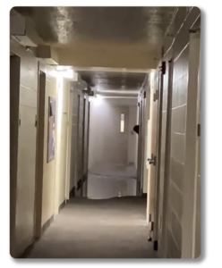 When a flooding emergency occurs over a break and is not detected immediately, expensive and disruptive collateral damage can include mold, mildew, serious structural issues, and health risks for occupants. Above: flooding in a dorm.