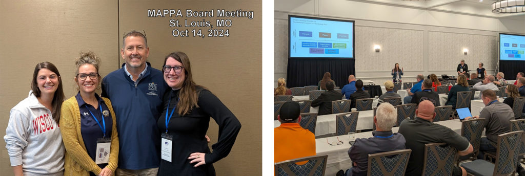 Left: MAPPA Board Meeting: Kayla McConville, Nicole Corll, Dan Ridgway and Ally Kosur; Right: UW-Madison Presentation: “Safety, Technical and People Skills Development” presented by Kayla McConville, Jacy Whitehead and Lorraine Schwager.