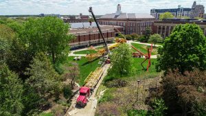 A large crane is being assembled west of Love Library. A summer project will close Love Library North, Adele Hall Learning Commons and the Love Library Link starting May 7. The project will remove deteriorating decorative structures — massive precast concrete panels and metal screens — that adorn the roofline of Love North. May 12, 2021. Photo by Craig Chandler / University Communication. Photo Credit: Craig Chandler | University Communication