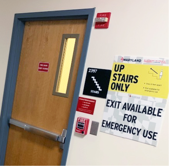 Keeping occupants from using the closest exit was not intended. However, it was necessary for fire safety managers to find ways to make sure egress was not overlooked. Circulation plans prepared by facilities planners could be reviewed where available, although it was most important to provide an emergency egress message that would not be lost in a sea of signs. Ironically, it usually meant either more signs or modification of COVID-19 directional signs to indicate that exits and stairs were always available for emergency use—an easier task to accomplish with an in-house facilities management sign shop.
