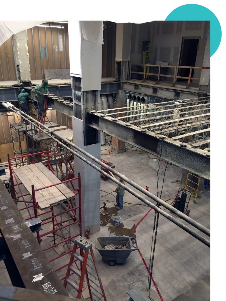 The main area of the Notre Dame library captured mid-construction, with the floor being removed to create the connected open space between levels. Photo courtesy of Miller Davis Company.