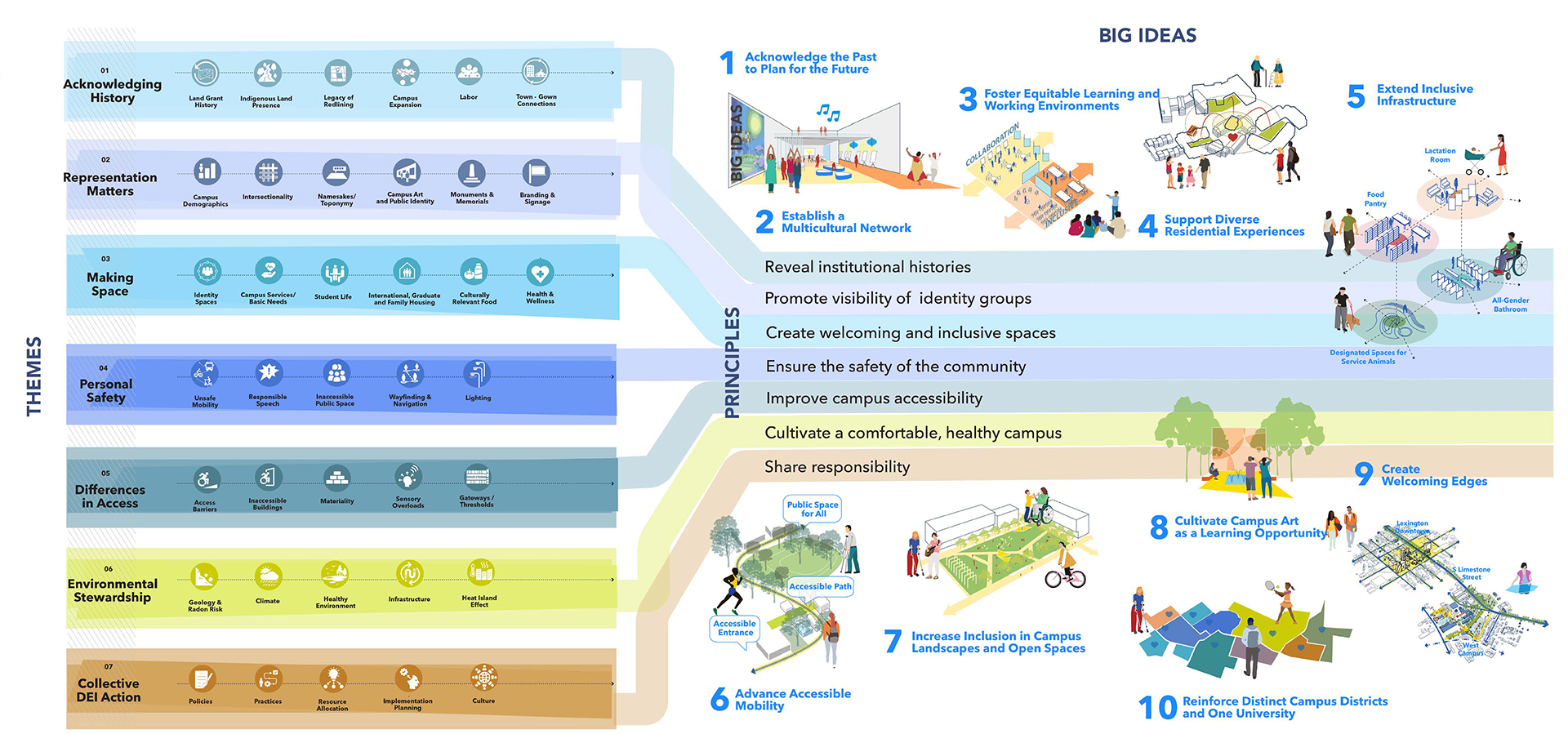 The University of Kentucky (UK) embraced a comprehensive planning effort—a first-of-its-kind DEI approach—that connects people and policies to the physical environment. A public research university with a campus population of 48,000 and more than 900 acres of land, UK is a land-grant institution and the flagship university for the state with a mission centered on excellence in education, research and creative work, service, and healthcare. In 2020, UK launched a multiyear DEI Implementation Plan with senior leadership, faculty, staff, students, and community champions working across a range of focus areas with 17 projects to inspire institutional change and action.¹ Stemming from this comprehensive plan, the DEI Facilities and Spaces Plan emerged, dedicated to exploring how the design of the physical campus can support DEI goals. This plan identifies campus barriers and develops future recommendations for how the physical environment can foster greater inclusion where all members of the campus community can thrive.