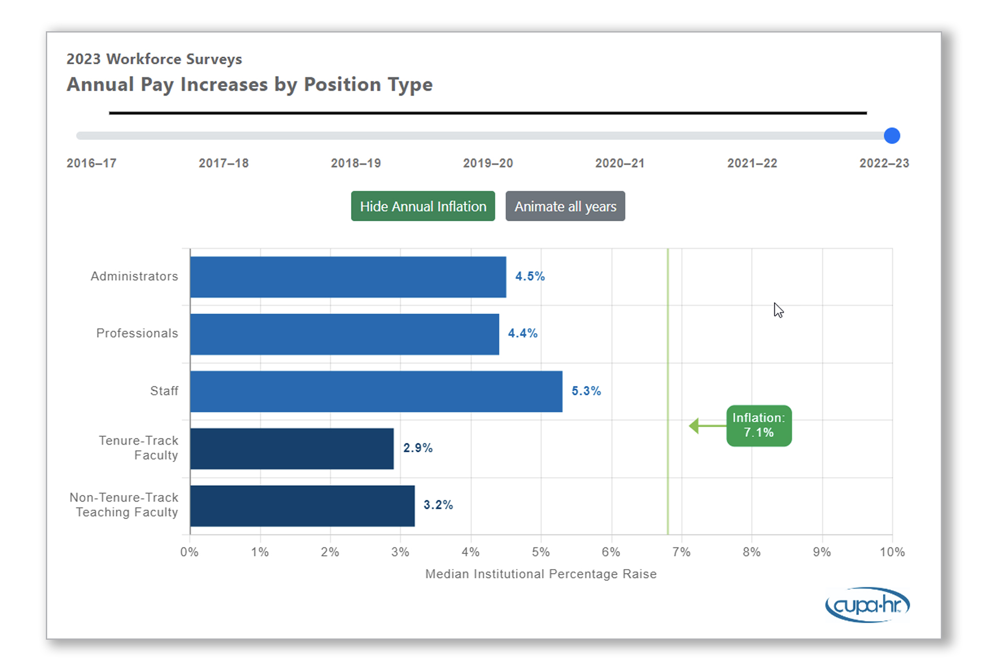One report looked at Workforce Pay Increases. The following is excerpted from CUPA-HR, and the full report can be found at https://www.cupahr.org/surveys/workforce-data/workforce-pay-increases/.