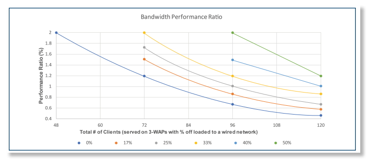 Three wireless access point network performance for different percentages of clients offloaded to a wired network for an increasing number of clients.