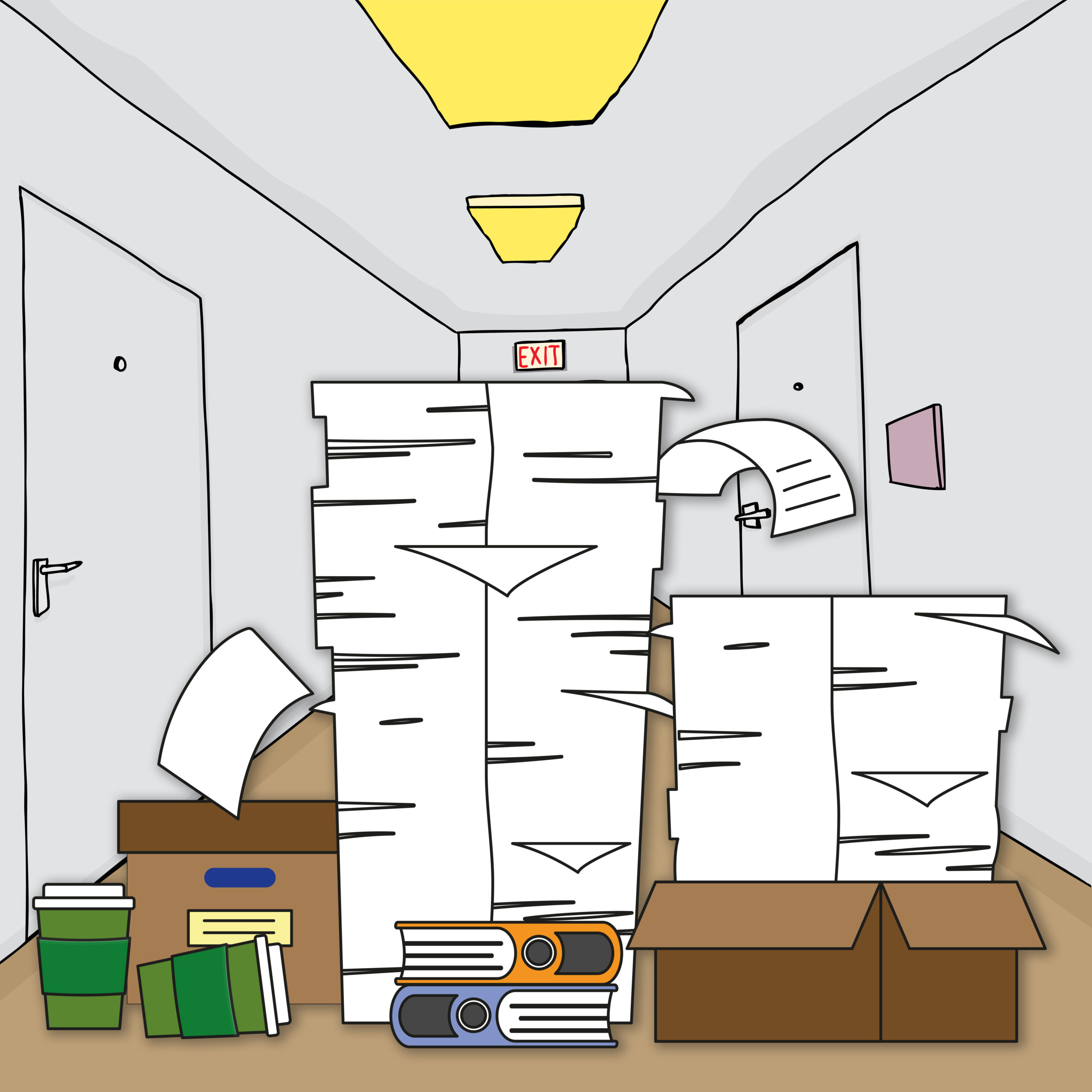 Where do storage and other items go when there is not enough space? Hallways are quite common. They are convenient and right outside the door. It may not be obvious who “owns” the hallway. It may be “owned” by the department that occupies the building or “owned” by Facilities Management. In some cases, if a department is the primary occupant (e.g., Chemistry Department in the Chemistry Building), they may believe they “own” the hallway. If they “own” it, why can’t they use it the way they want?