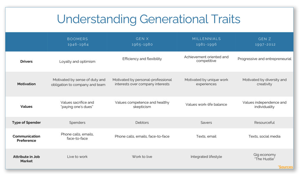 - Gen Z: Native to mobile devices and FaceTime, value compensation and diversity.