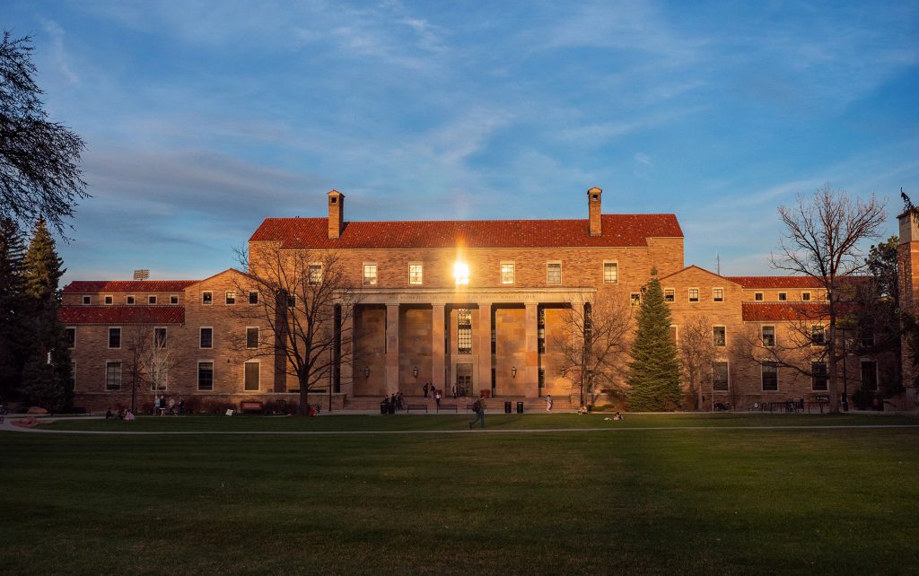 Norlin library at sunset. (Photo by Glenn Asakawa/University of Colorado)