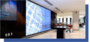 - A pitch room featuring a 9-ft. × 16-ft. video wall, custom maple step-style seating, and Fabritrak custom-graphic acoustical panels