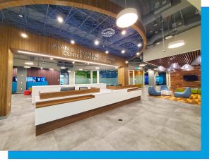 The Center of Innovation is a public-private partnership between Nova Southeastern University (NSU) and Broward County, acting as an economic and education development engine linking the South Florida innovation ecosystem. Designed by P2 Interiors and ACAI Associates, the Levan Center project consisted of building out 54,000 sq. ft. of shell space on the existing fifth floor of NSU’s Alvin Sherman Library building. Construction was completed in nine months by JWR Construction Services. The total project costs were $12 million. This unique facility features fun and bold spaces that are designed to celebrate creativity, innovation, and technology, including:
