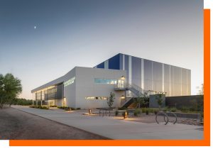 Pima Community College’s new Automotive Technology and Innovation Center is the first completed building project at the Downtown Campus, part of the new Center of Excellence (CoE) in Applied Technology. The CoE is a collection of academic and technical buildings that offer transportation, advanced manufacturing, building construction trades, workforce development, and computer-aided design (CAD) design studies focusing on degree and certificate programs, as well as tailored industry and community training courses. The 43,000-sq.-ft. LEED Silver Automotive Technology and Innovation Center includes 27 vehicle bays, 10 EV-ready bays, 3 heavy transportation bays, 3 original equipment manufacturer (OEM) labs, and a dynamometer room. A large terrace surrounding the entrance provides an inviting shaded area to host industry events, while also connecting the new building to the primary campus walk. Visitors are welcomed to the center with a large, showroom-style lobby and can enjoy expansive views of the bays from the second level, which includes conference rooms, classrooms, offices, and collaboration spaces. Throughout the shop space, translucent wall panels provide daylighting for the work bays and an exterior blue glow at night. The overall building massing and orientation encourages natural ventilation. This design marks a movement in educational pedagogy to adapt a more collaborative learning model for students and the local community.