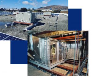 FIN projects are submitted on an annual basis and ranked based on two scoring categories—likelihood of failure and risk impacts. The projects are then reviewed by a governance committee and voted upon for approval. The two recent projects below are examples of the work delivered by the Facilities Services Infrastructure Programs FIN team. The Oyster Point Air Handling Unit (AHU) Replacement project replaced four natural gas air handling units. The AHUs chosen for replacement were high-efficiency heat pump units. By switching to heat pump units, we are able to reduce greenhouse gas output by 10 metric tons of CO2 annually. This saves $2,400 a year in energy costs and utilizes electricity produced by the roof-based solar system. The project added controls monitored via the network and tied the units into the building’s fire life safety system. The Parnassus Heights Campus Millberry Union Gym Supply Fan Replacement project replaced two single-speed, low-efficiency fans with two high-efficiency fan wall units. The installation of the fan wall units provides an annual utility savings of $5,000 and increases air filtration for the gym. The units are controlled by four variable frequency drives, connected and controlled via the campus network, and tied into the building’s fire life safety system.