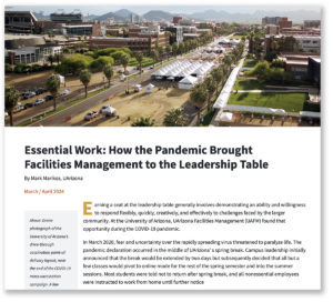 In his cover story on how the covid-19 pandemic brought FM to the leadership table at the University of Arizona, for example, Mark Marikos outlines the FM department’s emphasis on communicating, collaborating, anticipating, and innovating during that difficult time, including managing a massive vaccination effort that served 243,000 people. “The experience was immensely gratifying, uniting us as part of a larger team and putting our abilities and customer service attitude on open display, cementing our relationships with other entities around the university and broader community,” Marikos writes.