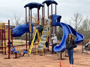 Author Larin Davis (foreground) at the site of a new playground being built for Richmond Elementary School.