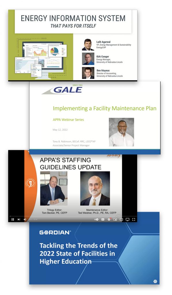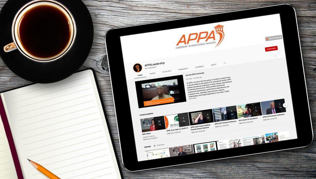 APPA’s YouTube channel, APPALeadership, is the comprehensive archive for all past webinar, Town Hall, annual conference, Body of Knowledge, and other content presentations of value to facilities professionals at colleges, universities, K-12s (public and independent), and other educational organizations.
