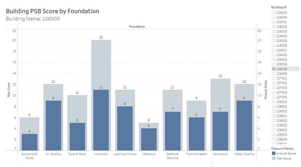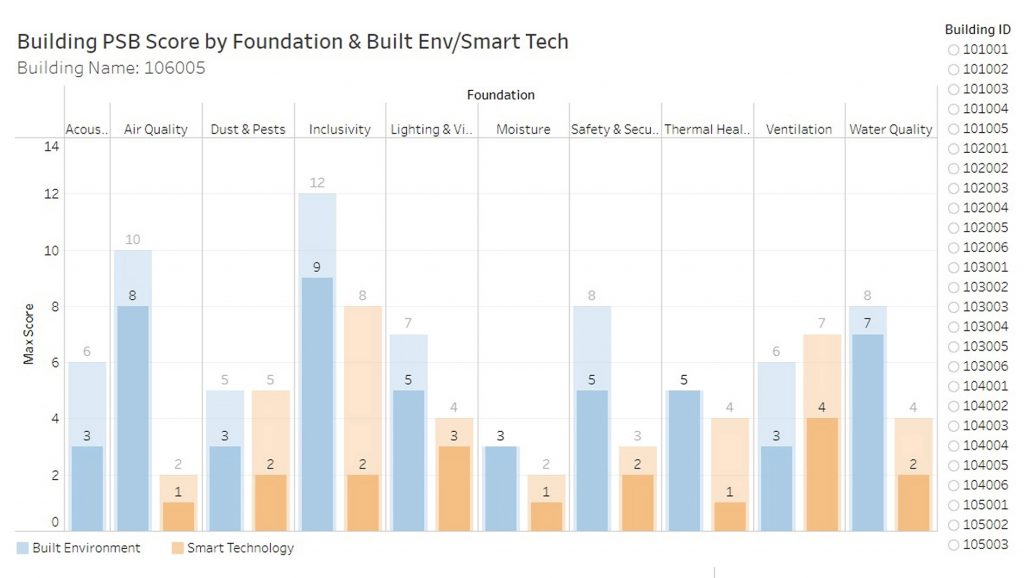 Each of the ten foundations in the PSB framework includes an assessment of the built environment elements that support occupant productivity. Most of these foundations also have an assessment of the smart building technology elements that measure, monitor, or identify the continuous integrity of those built environment elements.