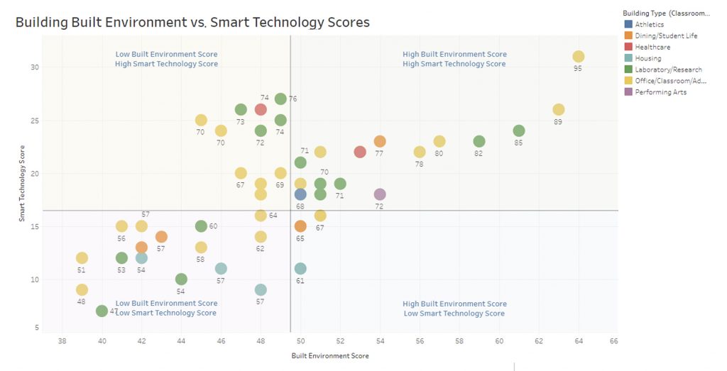Figure 3: Plots the Built Environment Score against Smart Technology Score. Highlights buildings that can benefit from one or both types of investments.