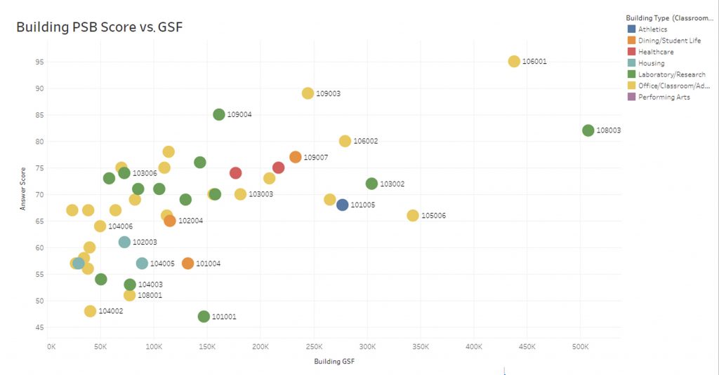 - PSB scores can be tied to additional facilities metrics such as energy use intensity (EUI), metric tons of CO2 equivalent (MTCO2e), APPA Facilities Performance Indicators (FPI), Facility Condition Index (FCI), and occupant density, among others. This makes the PSB scores more valuable as a tie between the facility operation metrics and occupant productivity.