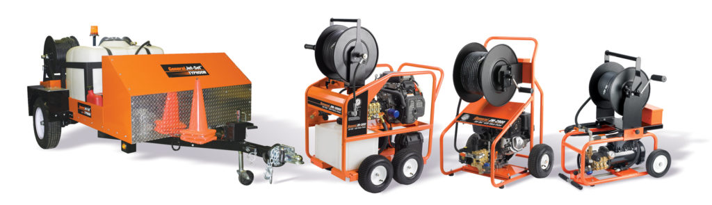 GENERAL PIPE CLEANERS rugged, reliable Jet-Set® Water Jets slice through grease, sludge, sand, ice, and other “soft” stoppages that many cable drain cleaners can’t clear. Water jets unleash high-pressure water streams that pulverize clogs—and flush them away. Nozzle thrust drives the hose down lines and gives wall-to-wall pipe cleaning action. General’s rugged, reliable water jets are excellent for blockages in hospitals, schools, sports arenas, care facilities, waste treatment plants, septic systems, and more. Compact and economical, they’re superb for clearing smaller and inside 1½”– 4” lines, like sinks and laundry drains. Hand-carry 23-lb JM-1000 Mini-Jet™ right to problems in its rugged metal diamond plate case. Or wheel the trim JM-1450 right to troubles. Its telescoping handle and detachable hose reel make maneuvering easy. And both pack 1500 psi of cleaning power. For more details of models, contact General Pipe Cleaners by visiting www.drainbrain.com/jets.