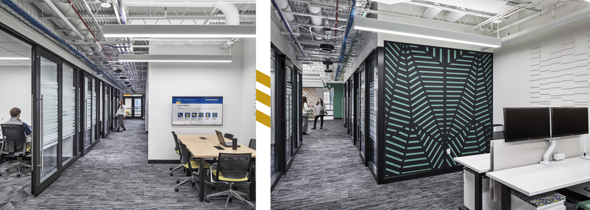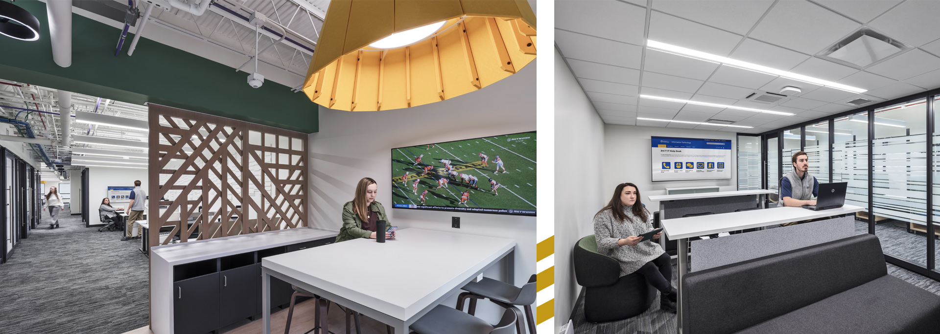 Left: The break room; the hybrid office accommodates one sixth of the full IT department’s team on any given day. Right: Meeting rooms are equipped to accommodate in-person and remote team members on conference calls.Photo credit – © CKP Studio
