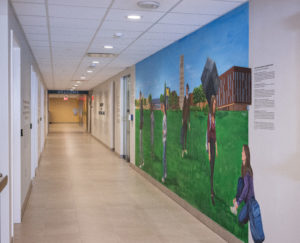 Ambatana – The Afro American Multicultural Lounge is one of the oldest multicultural lounges on campus, founded in 1972. It is located on the ground floor level of a residence hall at the end of a long hallway that was not particularly warm and inviting; in fact, many students did not realize the multicultural lounge was there. One of the primary goals was to transform not only the multicultural lounge itself but also the exterior hallway leading to it. Michigan Housing connected with local artists from Southeast Michigan and Detroit to create original murals on the walls of the hallway, including a mural of University of Michigan students walking toward the multicultural lounge, inviting all students to learn and engage. Outside this multicultural lounge are study alcoves that include seating with high backs and sides to provide additional privacy and flexibility for students.