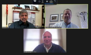 The facilities directors of the three PennWest campuses on a video call in February. Clockwise from top left: Ron Lincoski, PennWest California; Chad Thomas, PennWest Clarion; Mike Hannah, PennWest Edinboro.