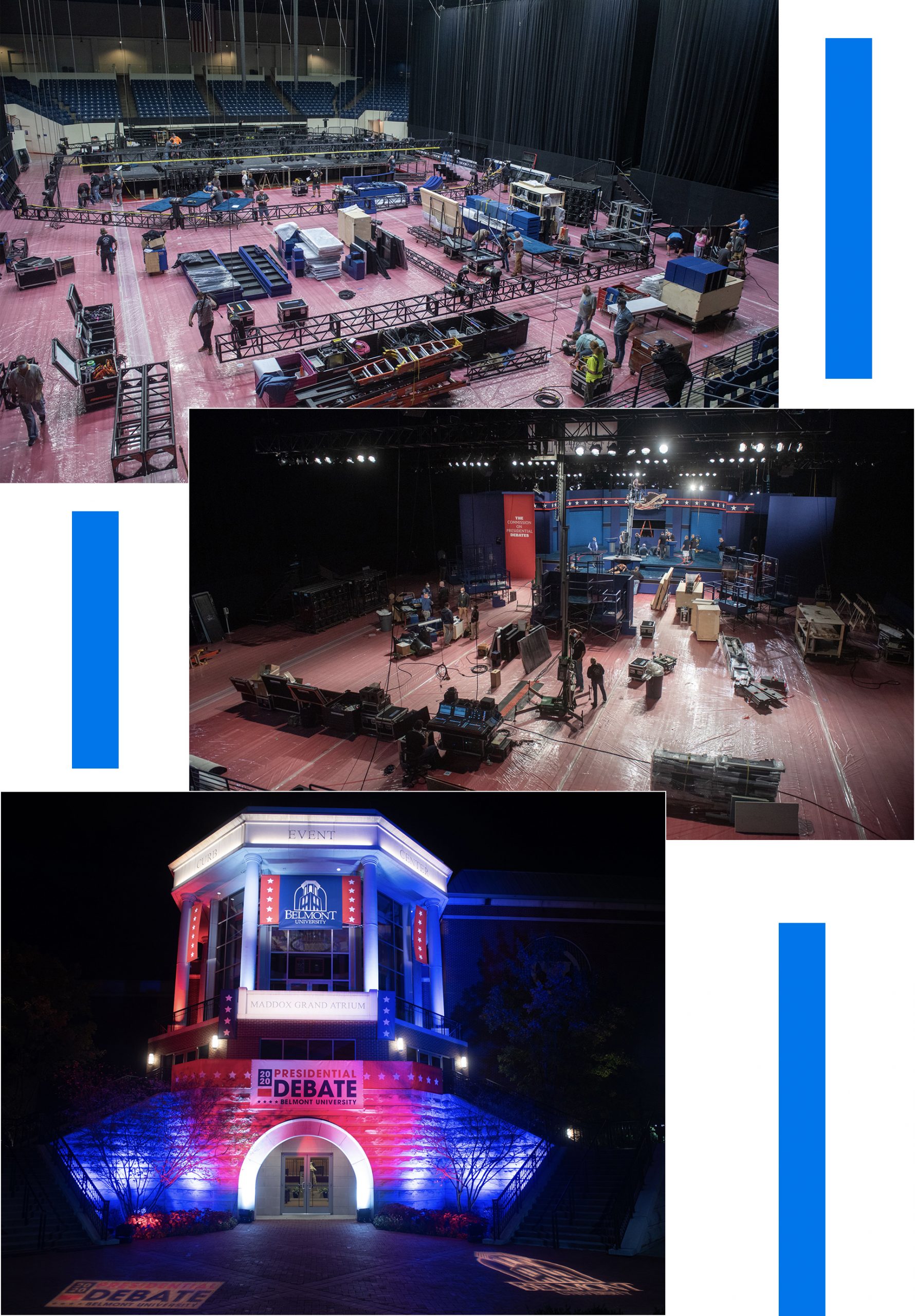 Top and middle photos: Workers install flooring, walls, and staging for the final Presidential Debate at Belmont University. Bottom: Exterior of Belmont’s Curb Event Center. (Photos by Sam Simpkins/Belmont University)