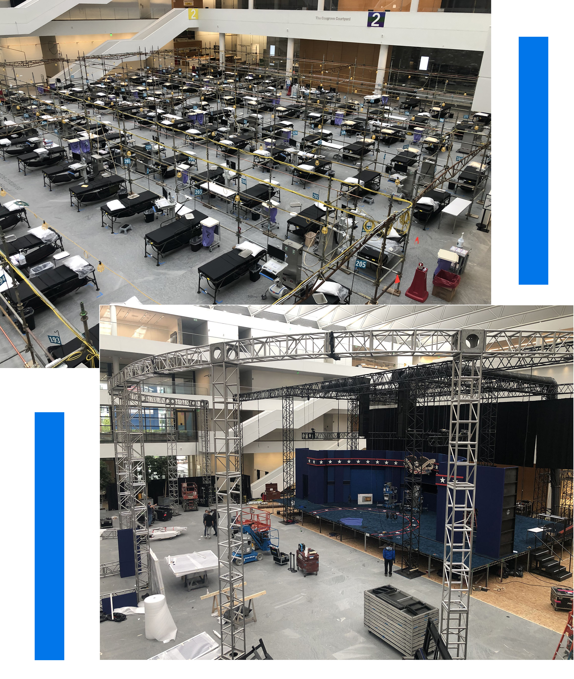 Top: Case Western’s event atrium in April 2020 as a 1,000-bed COVID-19 surge hospital. Bottom: The same space under construction for the first Presidential Debate. (Photos by Stephen Campbell/CWRU)