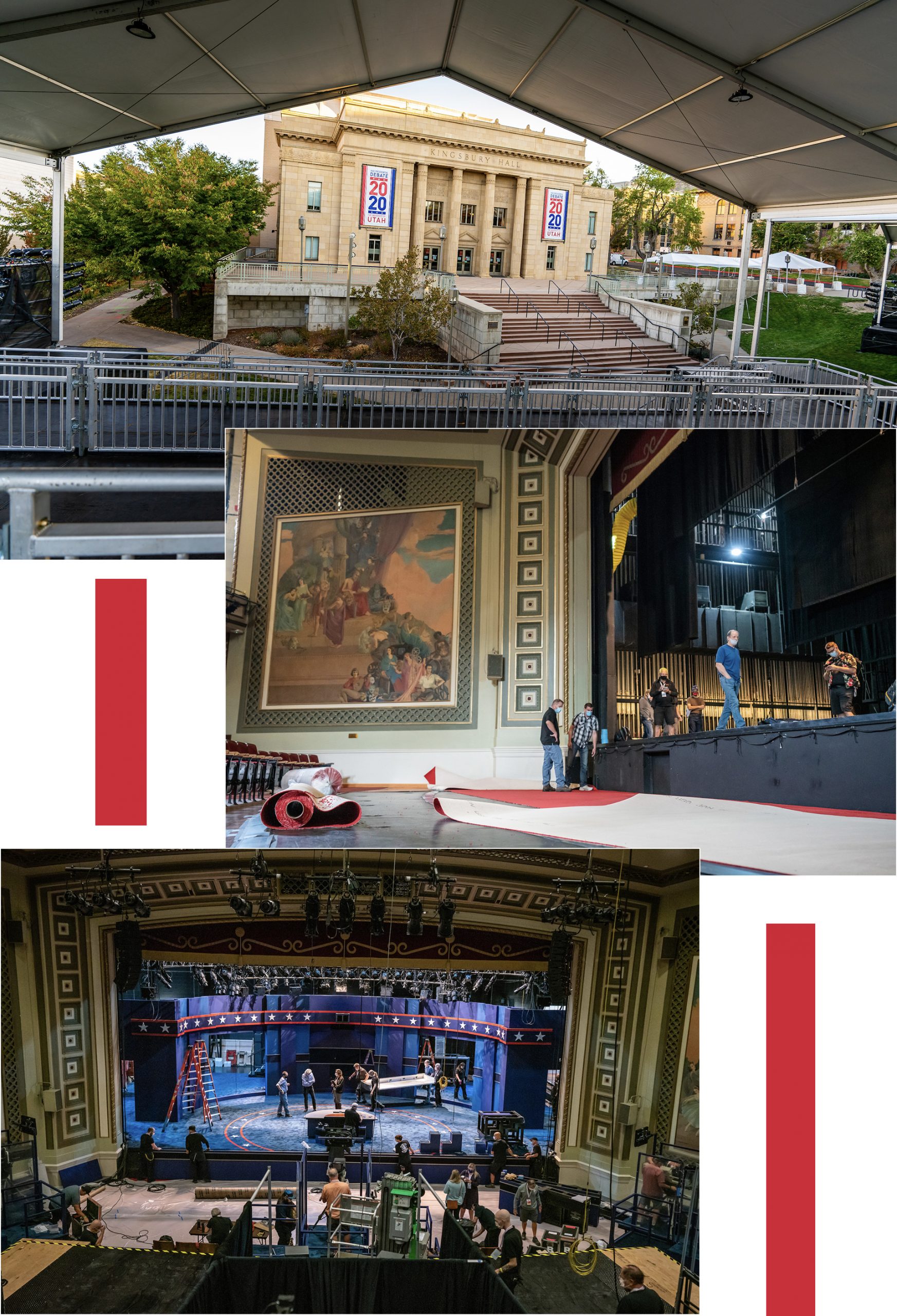 Top photo: University of Utah’s Kingsbury Hall debate venue exterior with media pavilion and standups. Center: Debate venue New Deal-era stage painting. Bottom: Kingsbury Hall stage build. (Photos by Dave Titensor/University of Utah)