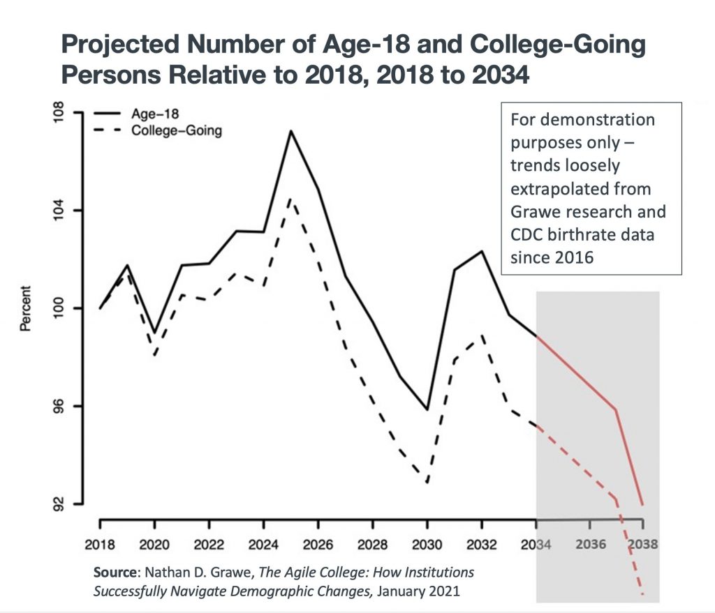 No issue has been more widely discussed than the basic variable of the pool of available students. Economist Nathan Grawe’s work demonstrates not only the downturn in the available number of domestic traditional college-age students, but also the transformation in the demographic mix that may very well reduce the number of those students who opt for college in the first place. For those students who choose college, changing expectations will further exacerbate the disconnect between the campus as it is today and what those new students will want and need from their college.