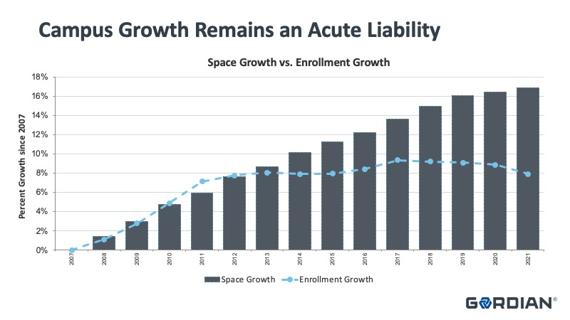 Compounding this challenge is the ongoing trend across higher education to increase space beyond enrollment demands, thus increasing the liability that the built environment places on diminishing institutional resources.