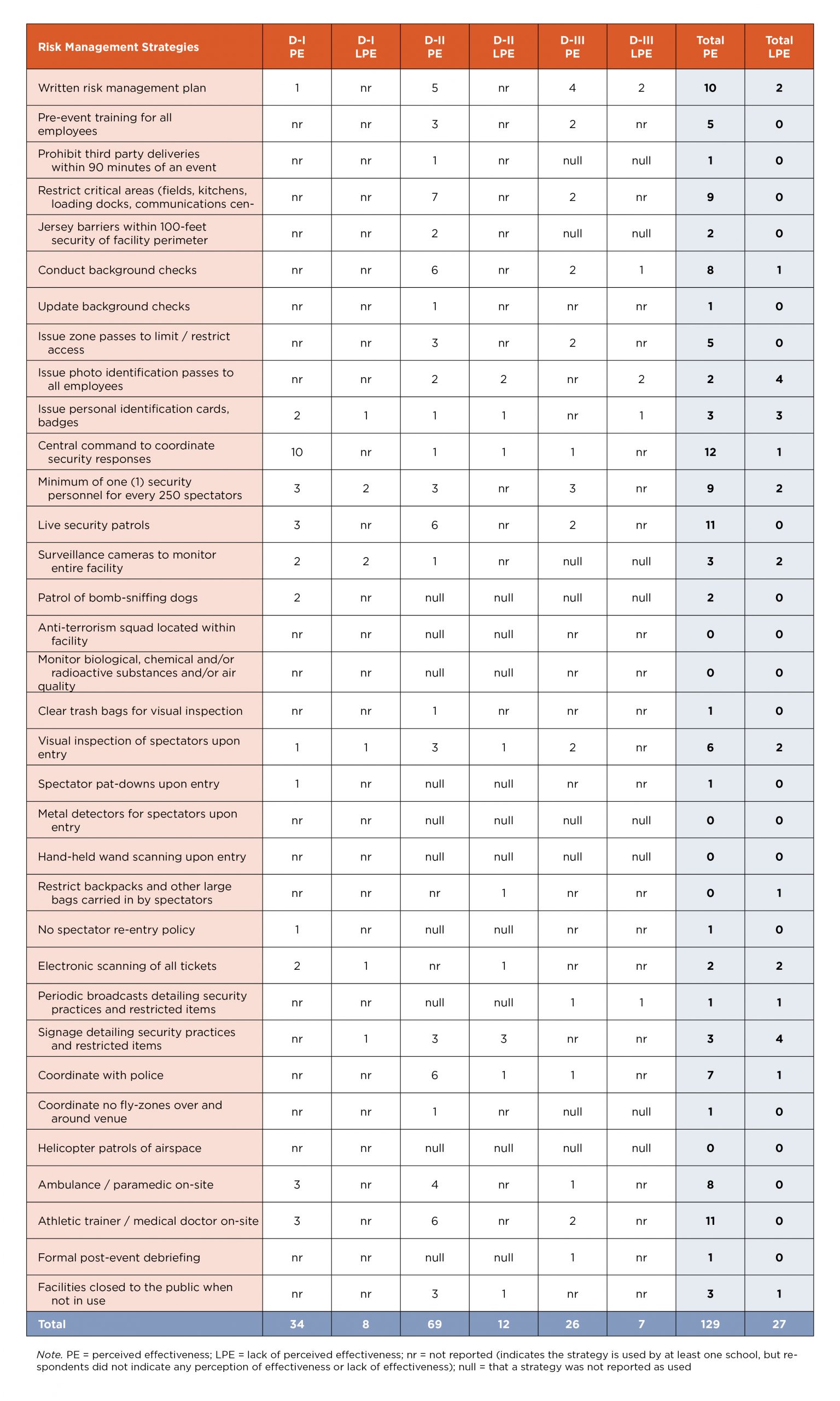 An athletic facility manager who perceives a risk management strategy to be effective is essentially expressing that it works. Perceptions of effectiveness may be influenced by common sense, experience and best practices, understanding patterns of human behavior, or recognizing threats. Whereas a lack of perceived effectiveness indicates that a strategy does not work, at least not every time. Most people in this study, especially those from D-II, believe that their strategies work. The most frequent successful strategies are as follows: for D-I, the use of a central command to coordinate security responses; for D-II, restricting critical areas; and for D-III, having a written risk management plan.